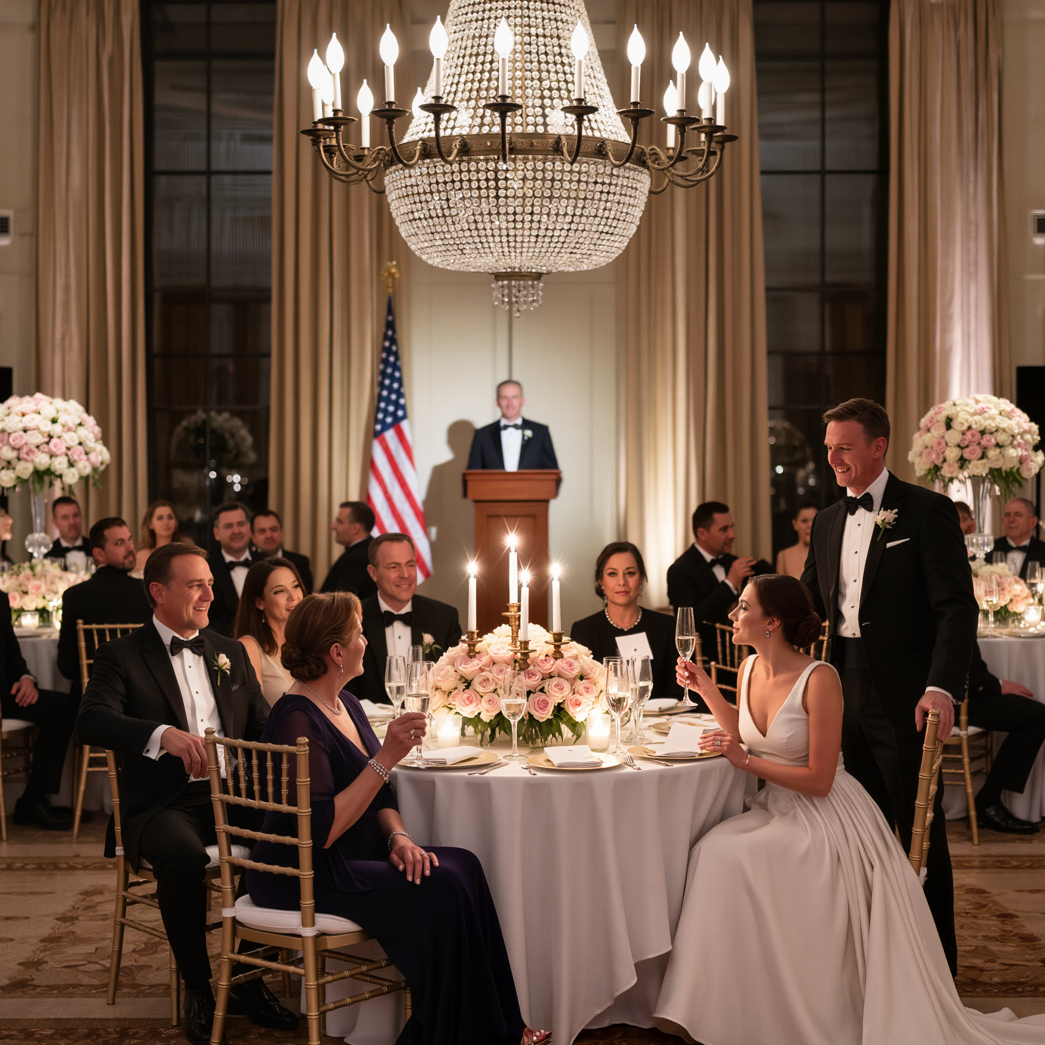 At 6:30, the dinner bell chimed, and guests made their way to their assigned tables. Each place setting included Helen’s beautiful floral arrangements, polished silverware, and one small white envelope bearing the guest’s name. I took my seat at the head table, directly across from Sarah and Brad. The happy couple was busy accepting congratulations and posing for photos, completely oblivious to what was about to unfold.