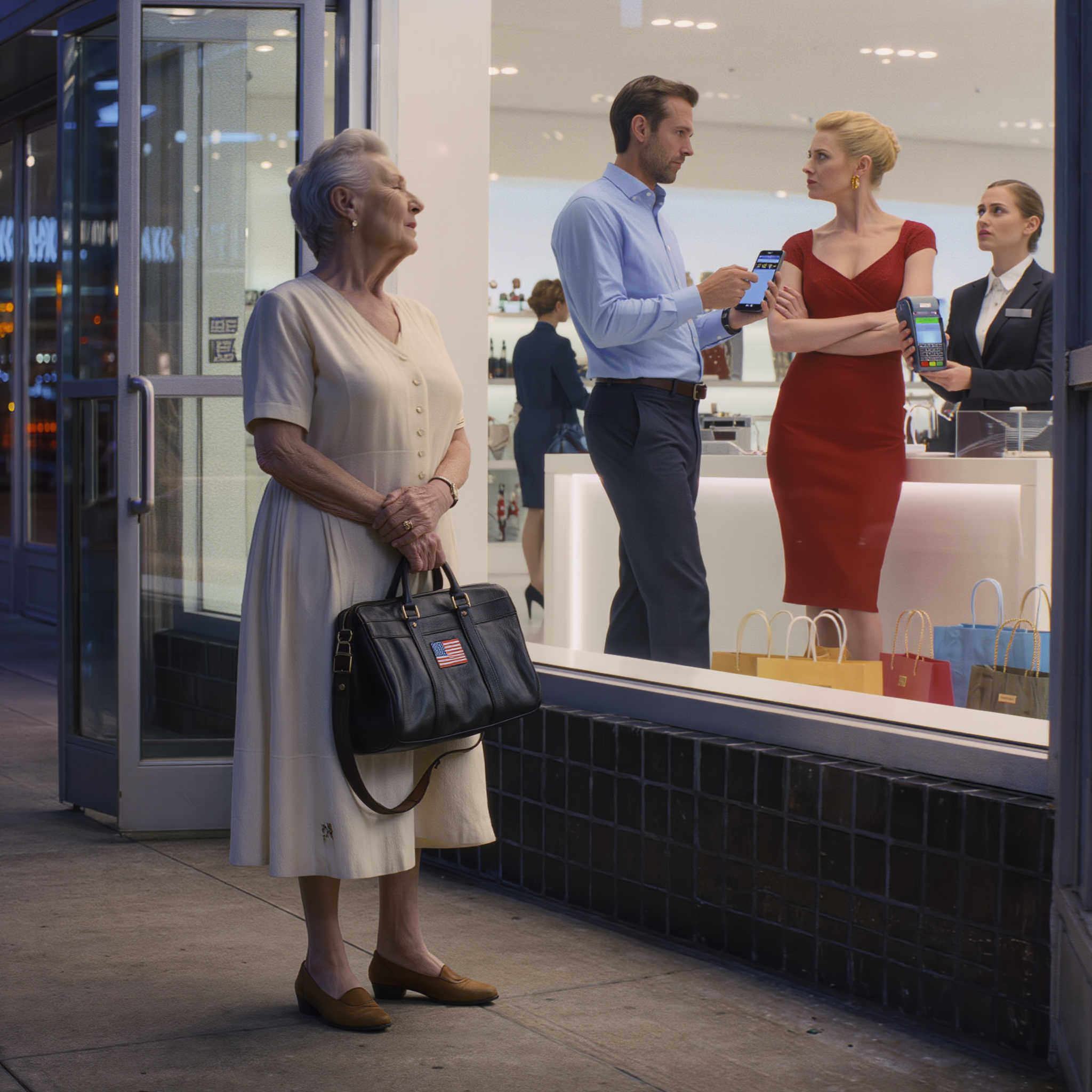 I didn’t think they would see me. I stayed out here because Michael told me to wait at the coffee shop on the corner, that they were just going to do some quick shopping, but I finished my water and walked a bit to stretch my legs. And that’s when I saw them go in here. Something made me stay. Something made me stand in front of this window as if I were just any other woman admiring dresses I could never afford, when in reality, I am watching my own son give his wife everything he denied me my entire life. The saleswoman says something I can’t hear, but I see Amber turn to Michael and speak with that red painted mouth that has always seemed too big, too loud. Michael nods. He takes out his card. The saleswoman takes it and swipes it through the machine. I grip my purse tighter and feel the old leather crackle under my fingers. This purse is 15 years old. I bought it when we buried my husband because I needed something black for the funeral and had nothing appropriate. Since then, I’ve used it for everything. For the grocery store, for the doctor’s office, for the few times Michael invites me to their house and I bring a homemade dessert, one that Amber barely tastes before saying it’s too sweet or too dry.