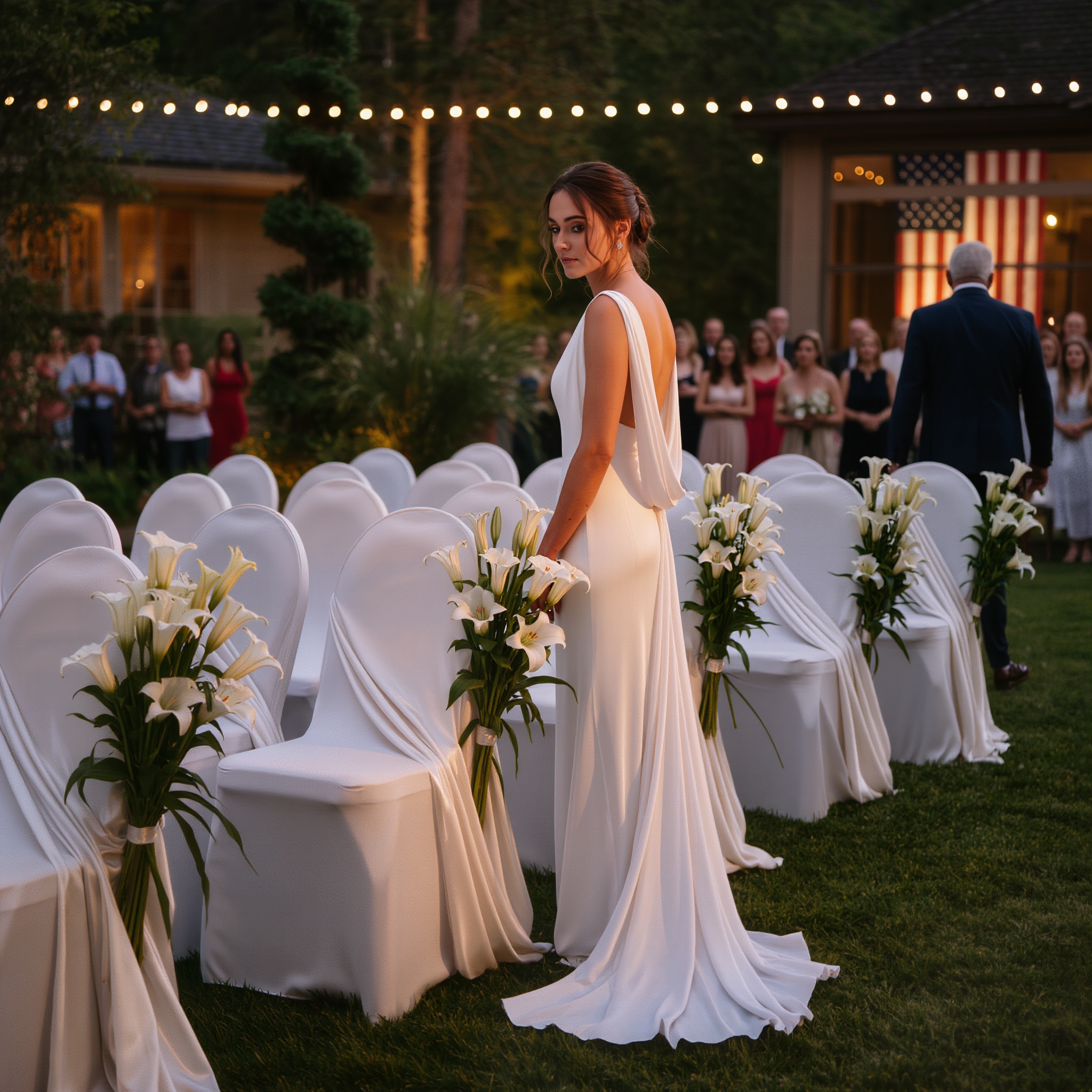 I stand in my wedding dress, fingers trembling against the painted wood of the garden door, peering through the crack at the rows of white chairs arranged on the emerald lawn. My heart sinks as my gaze fixes on the two empty seats in the front row, adorned with satin ribbons and small bouquets of lilies. The seats where my parents should be sitting right now.