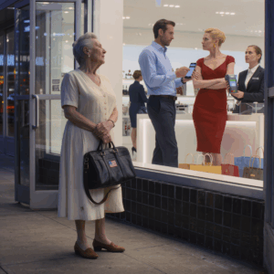 I am standing in front of the window of this luxury boutique, my wrinkled hands gripping the strap of my worn out purse,…